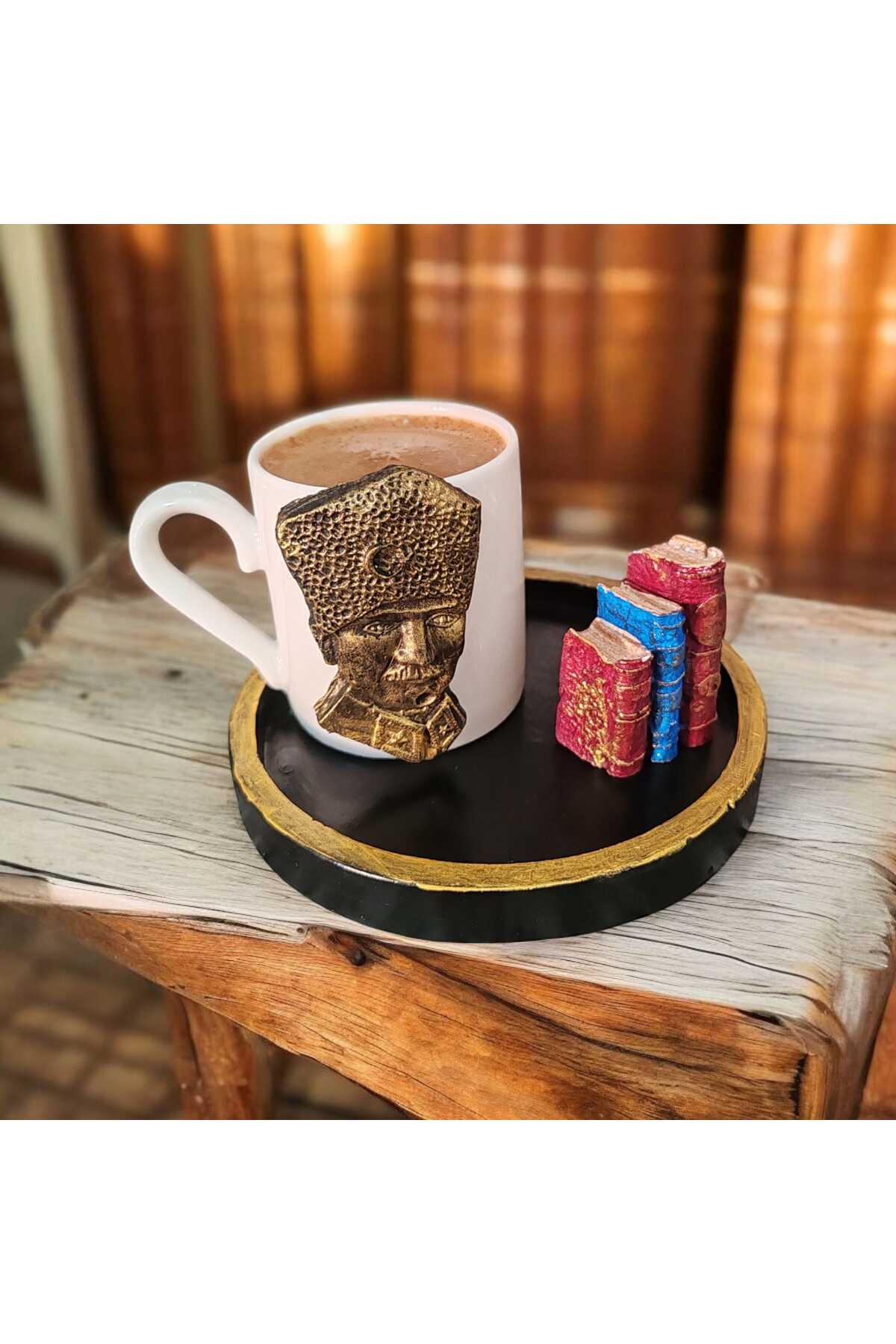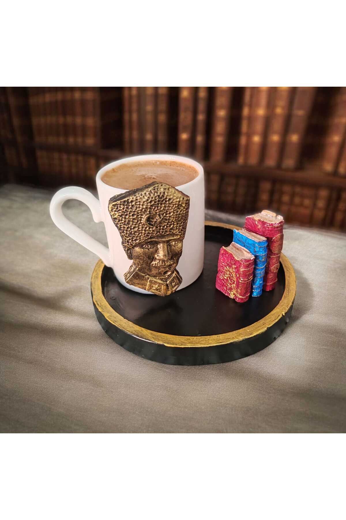 Atatürk Temalı Türk Kahvesi Fincan Seti – Özel Tasarım Fincan ve Kitap Dekorlu Sunum Tabağı