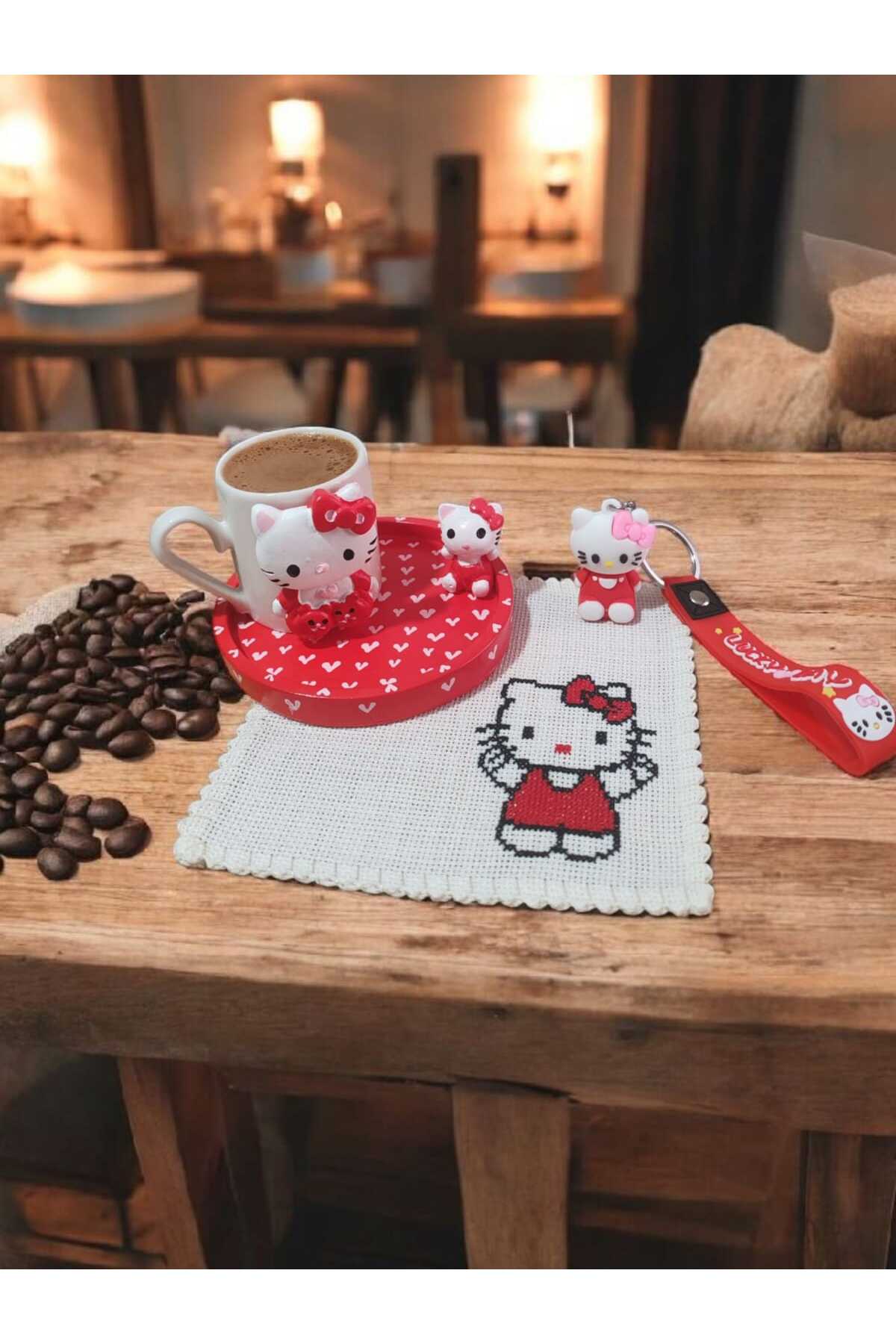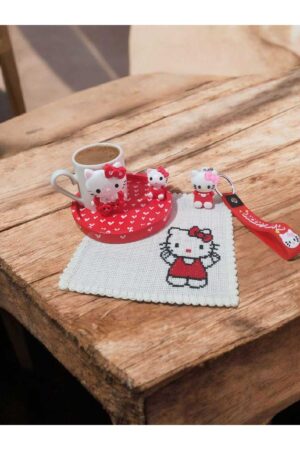 El Yapımı Etamin Peçeteli Hello Kitty Kahve Fincanı Seti – Özel Tasarım Hediyelik Dekoratif Set