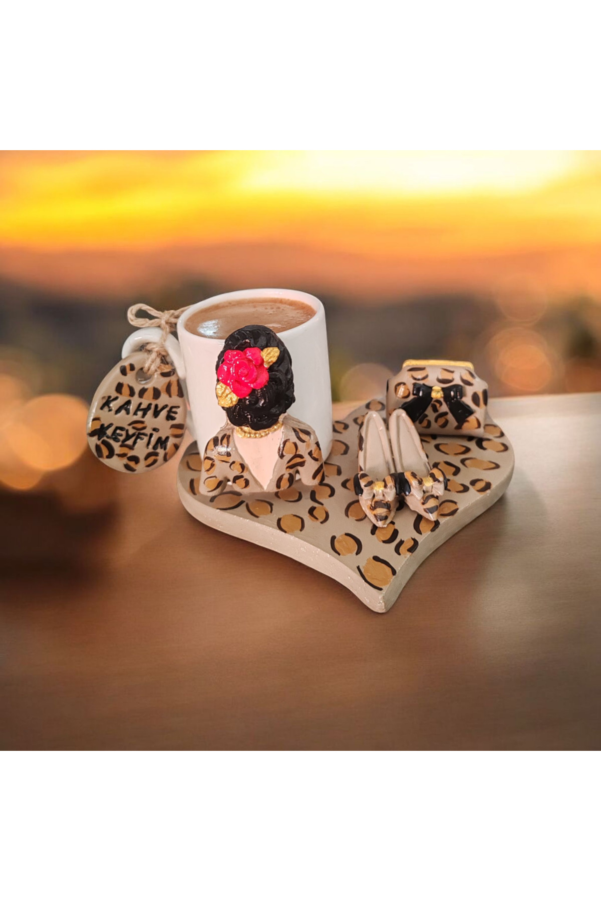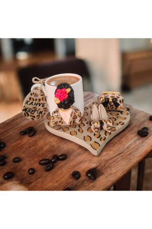 Leopar- Desenli kalp tabanlı Kadın Figürlü 1 Kişilik Fincan Set