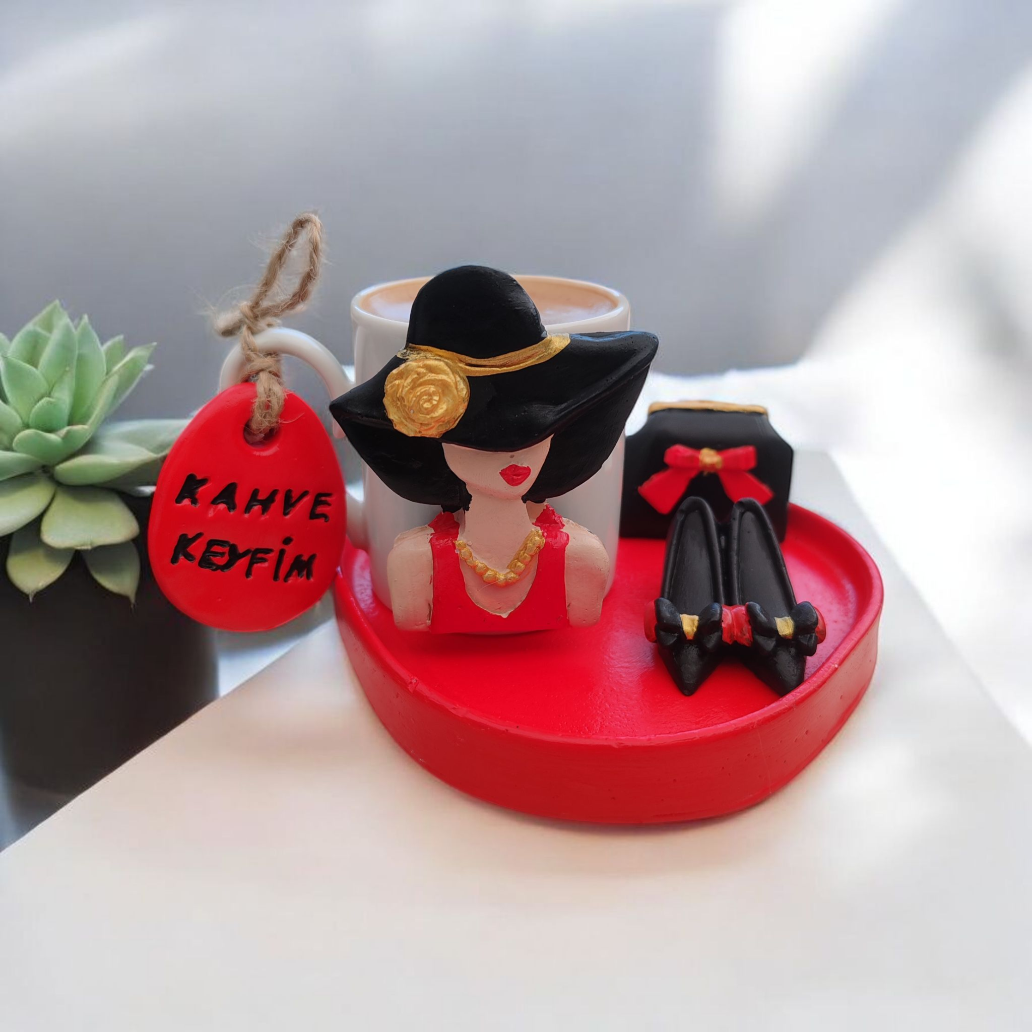 Taş tozundan el işçiliğiyle üretilmiş bu özel fincan seti, sofistike detaylarıyla göz alıyor. Şık şapkalı kadın figürü, zarif topuklu ayakkabılar ve çanta motifiyle tamamlanan bu set, sadece bir fincan değil, aynı zamanda dekoratif bir obje.