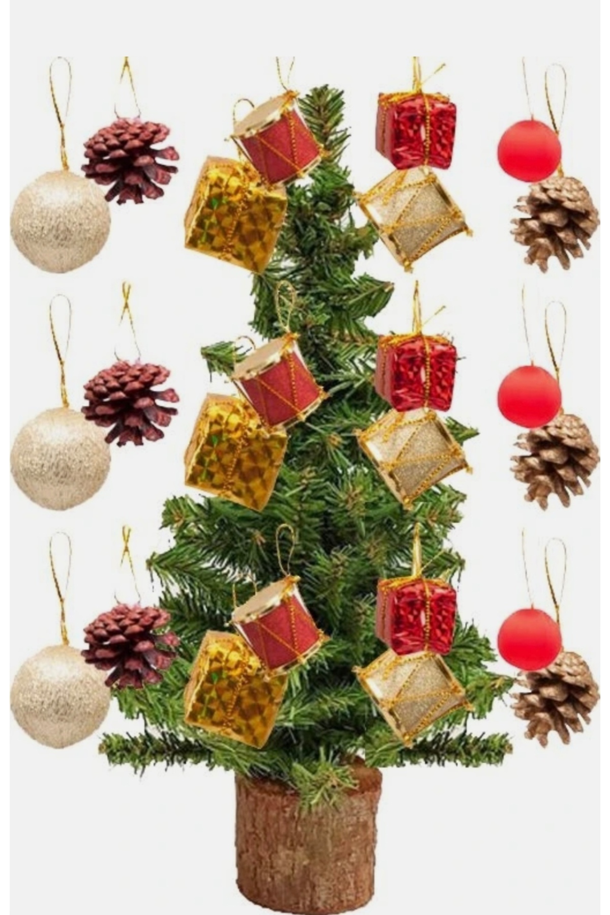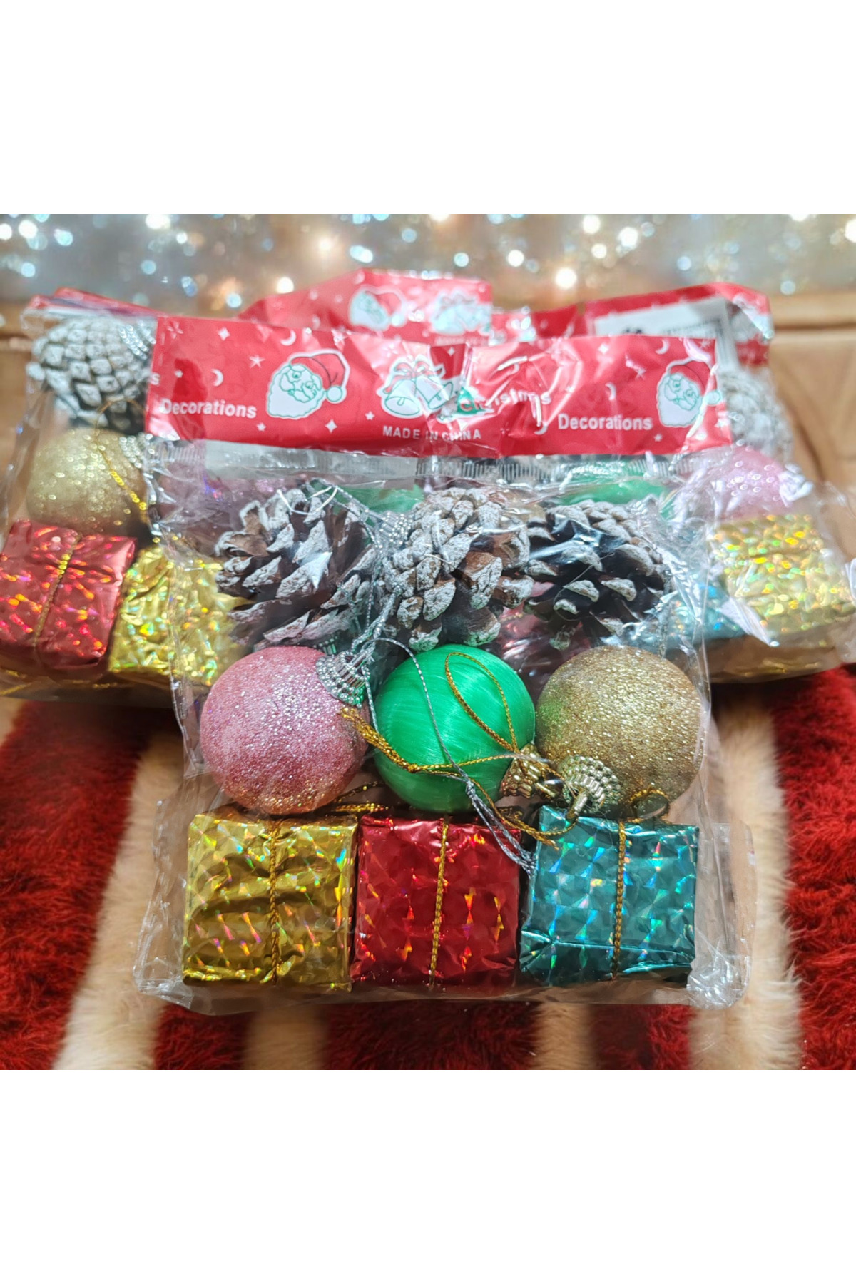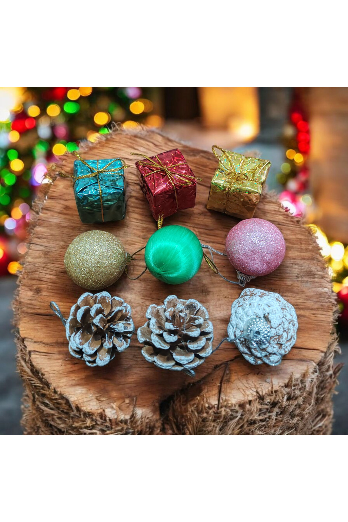 Yılbaşı Çam Ağacı Süsü Seti — Renkli Hediye Kutuları, Parlak Toplar ve Kozalaklar (9’lu Paket)